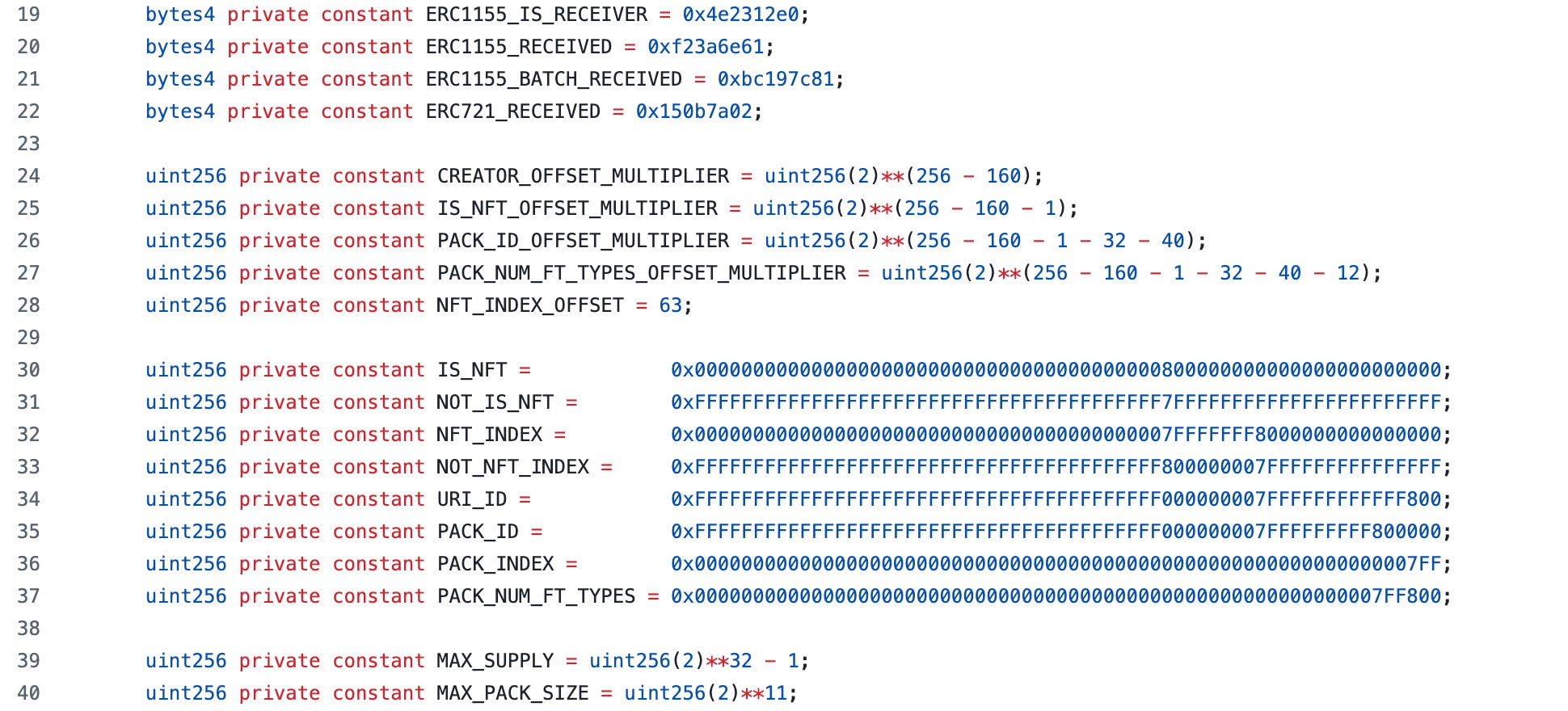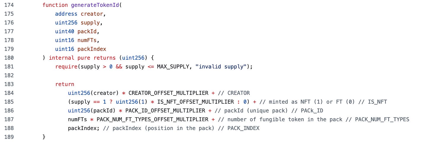 When minting single assets, an ASSET’s tokenId is generated by the internal function generateTokenId which uses a number of constant offsets that we can see at the beginning of the contract.